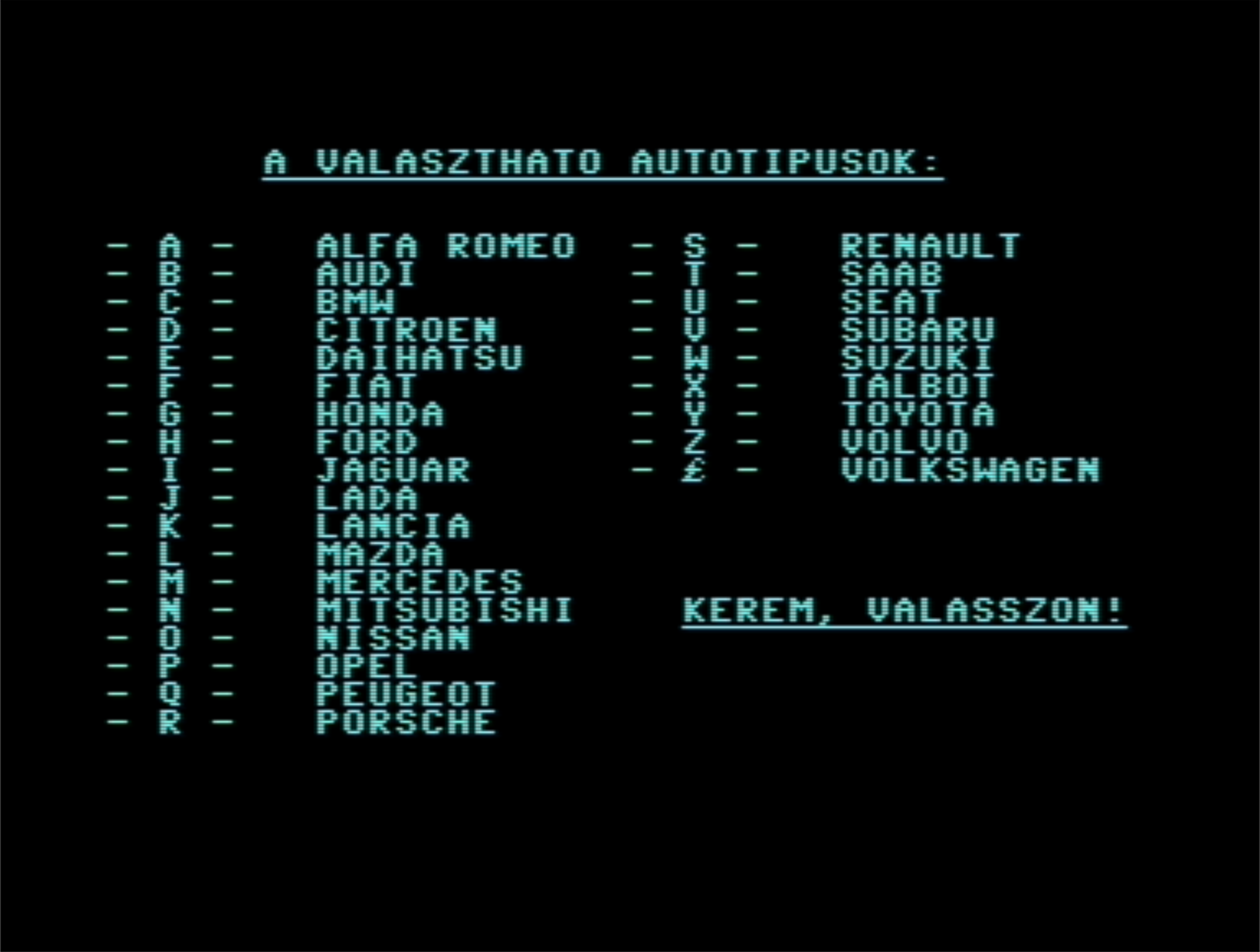 A felhasználó egy áttekinthető listából választhat autómárkát, betűkkel jelölt menüpontok segítségével. A kínálat széles: olyan ismert nevek szerepelnek benne, mint az Alfa Romeo, Audi, BMW, Citroën, Honda, Peugeot vagy a Volkswagen.