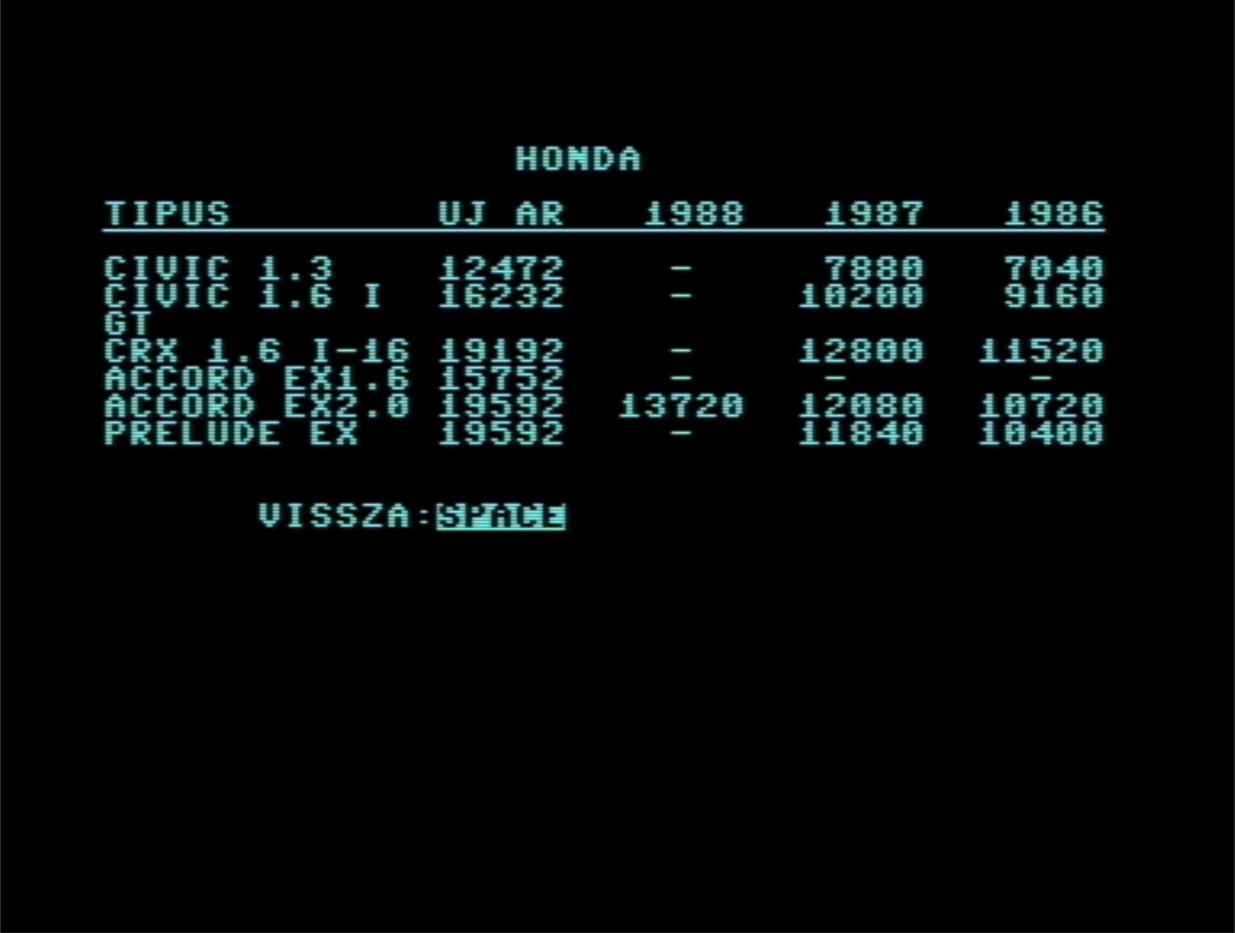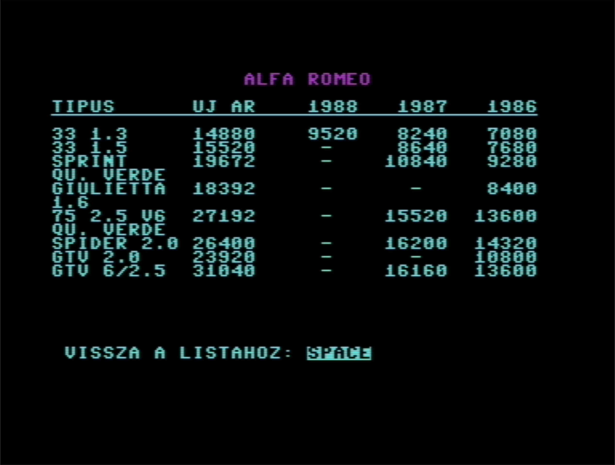 Egy márka kiválasztása után táblázatos formában jelennek meg az egyes típusok adatai. A listák tartalmazzák az adott modell újkori árát, valamint külön oszlopokban az 1988-as, 1987-es és 1986-os használtpiaci árakat. Nem minden típusnál áll rendelkezésre minden évre adat, ezekben az esetekben az ár helye ki van húzva.